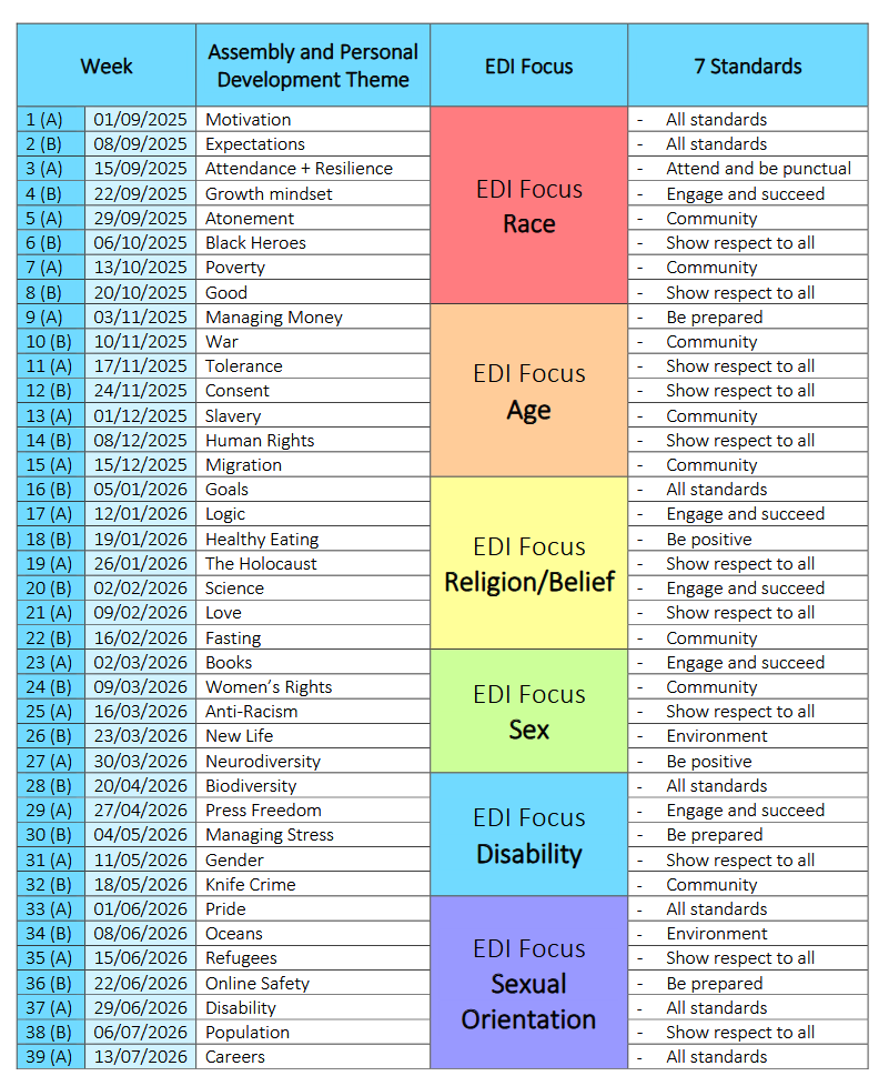 Each week, we centre our assemblies and Thought for the Week around a personal development theme. These themes are carefully chosen, varied, and closely linked to fundamental British values. At King James I Academy, our assembly programme reinforces our Academy values while supporting students’ moral, social, spiritual, and academic development, making a significant contribution to their overall growth. On Fridays, during tutor time, Thought for the Week provides students with the opportunity to reflect on current issues, engage in discussion and debate, and confidently share their views and opinions.