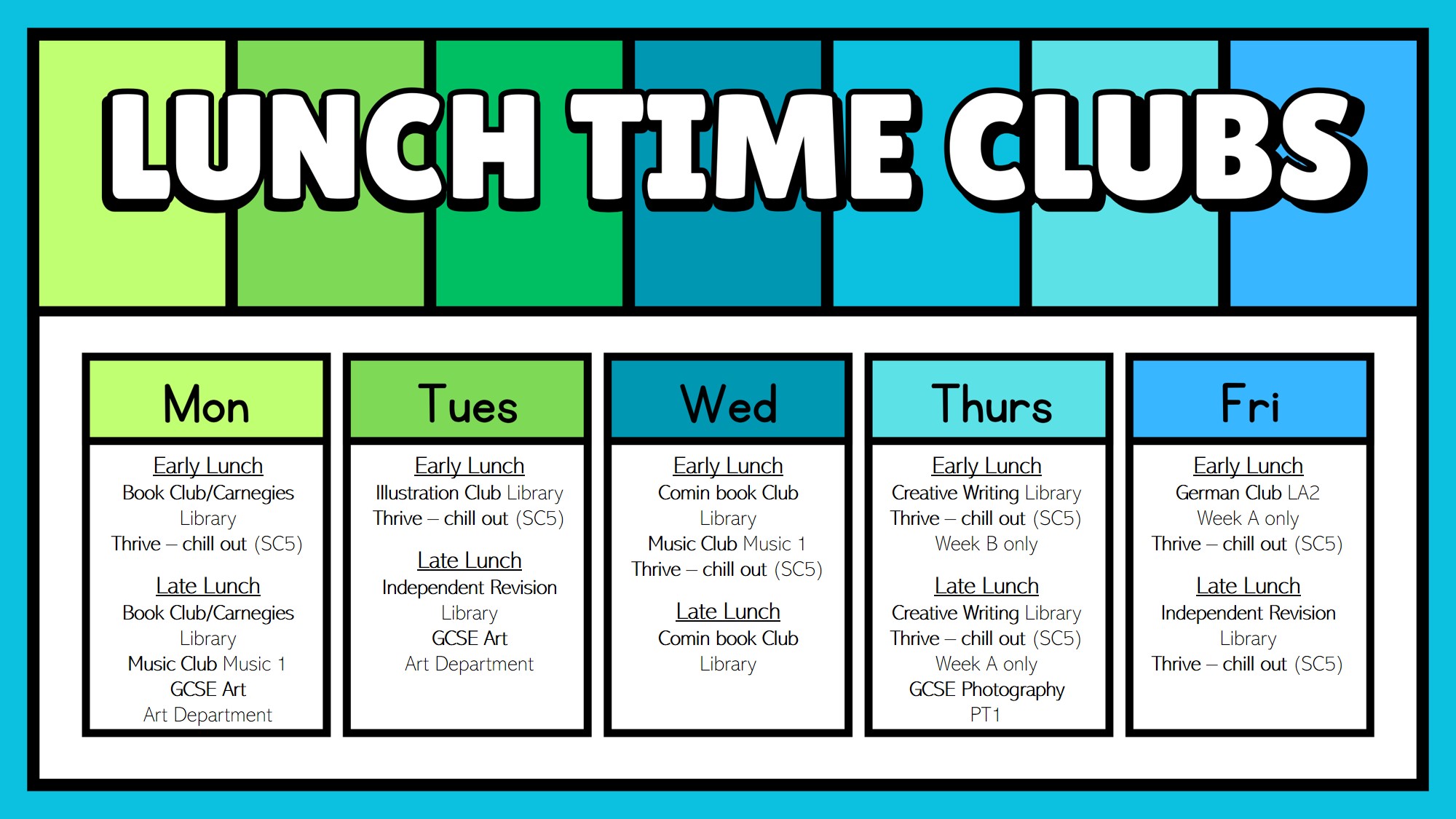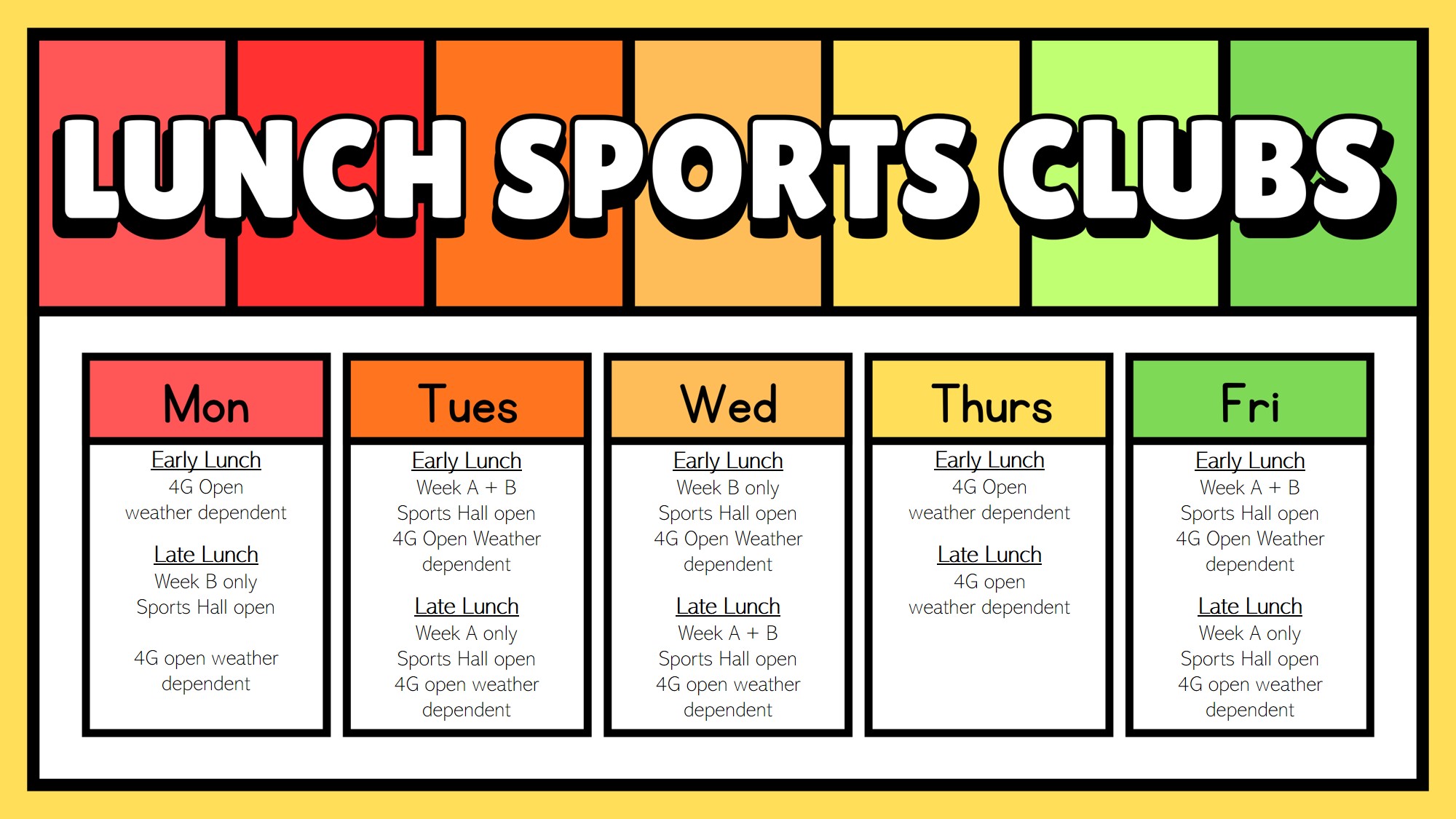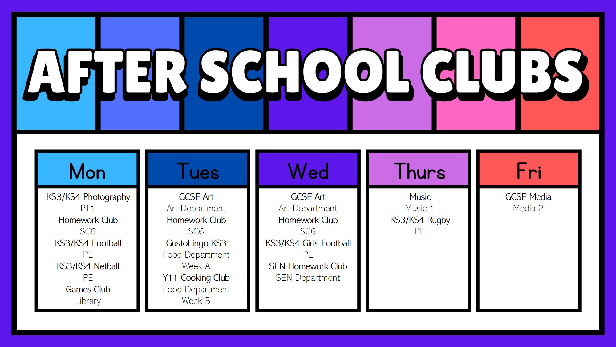 We have a wide range of enrichment opportunities available to students in all year groups. See the timetables below for our current lunch time and after school clubs as well as sports clubs. Our 4G pitch is also open on a lunch time for all students.