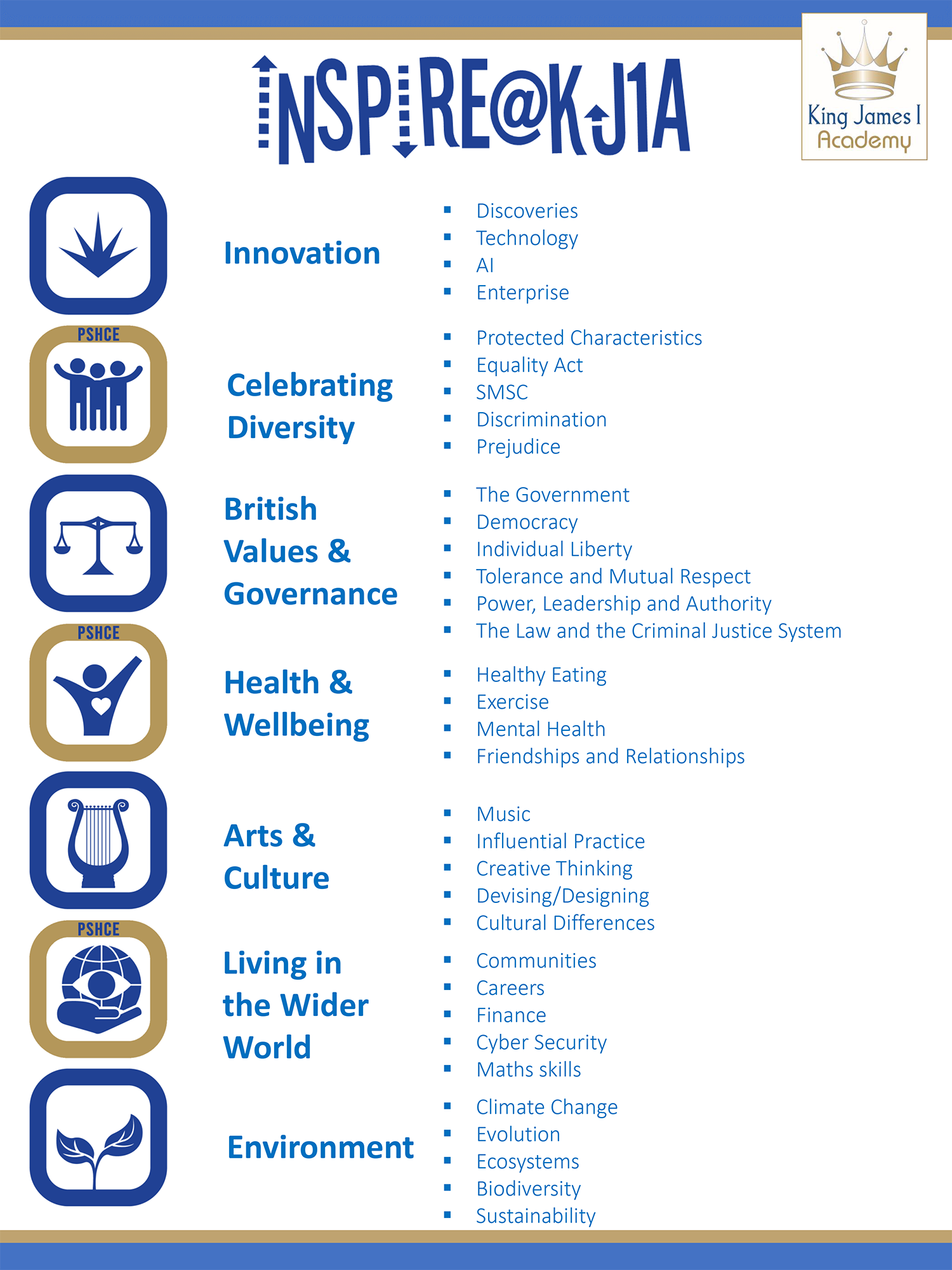 At King James I Academy, we have developed an Inspire Curriculum designed to help students make meaningful connections across different areas of learning. A set of key themes underpins this curriculum and is used by teachers within lessons to link knowledge and skills across subject areas.